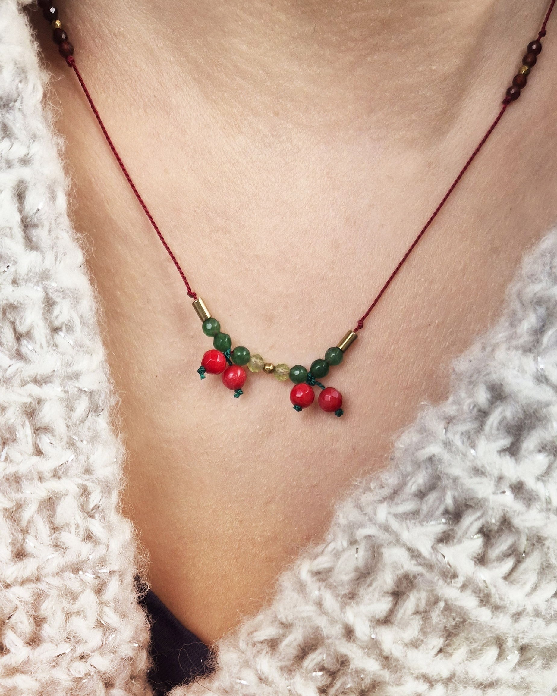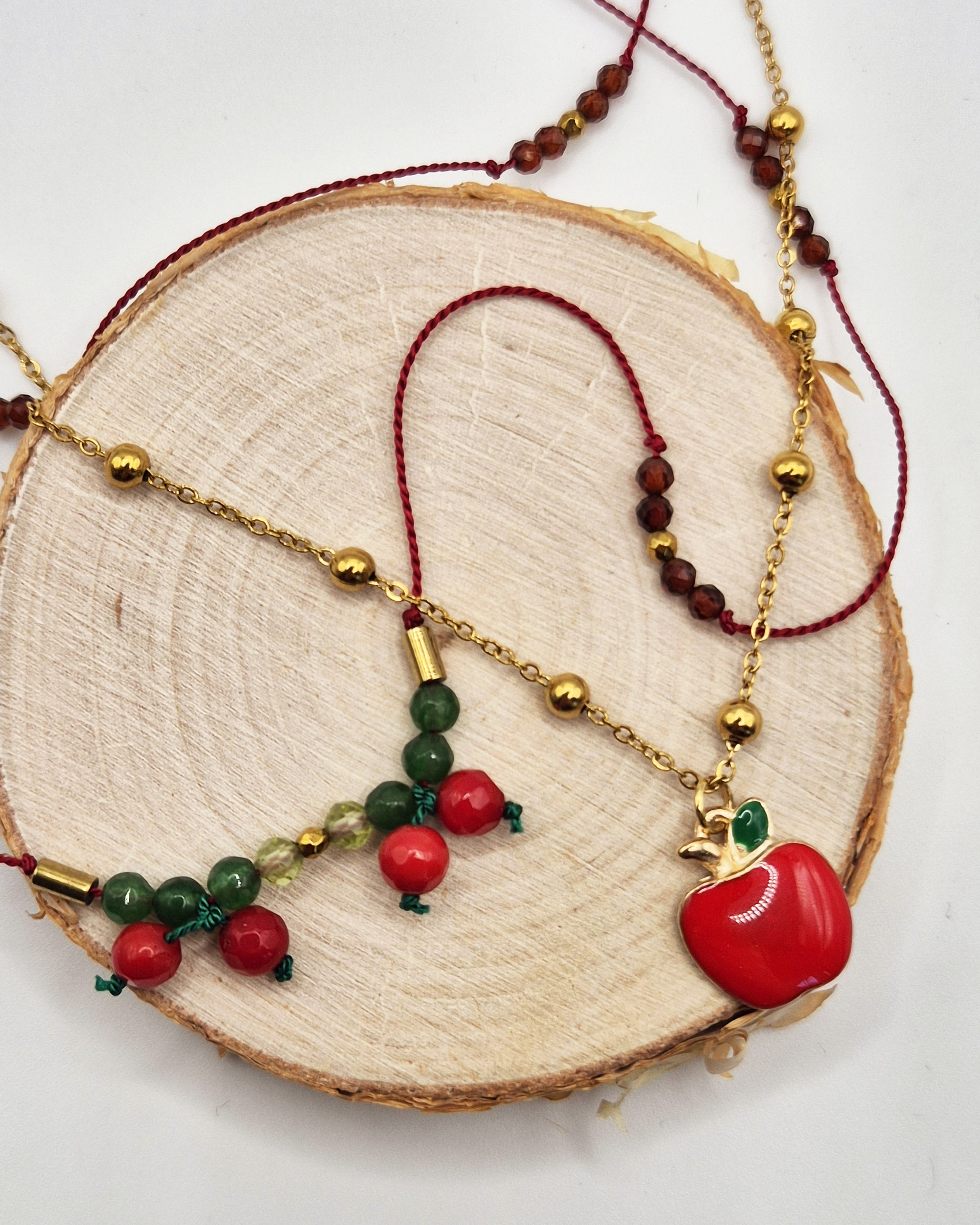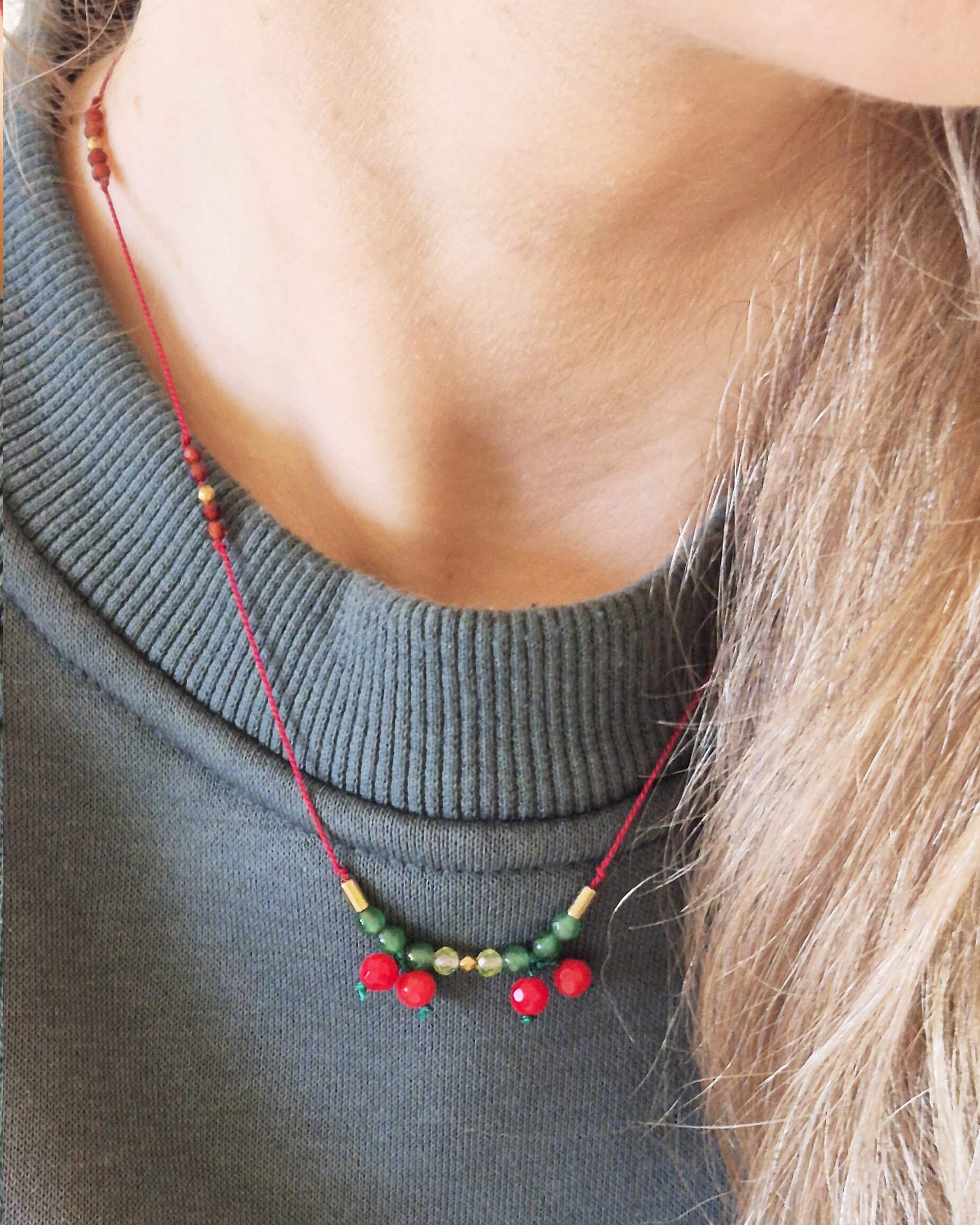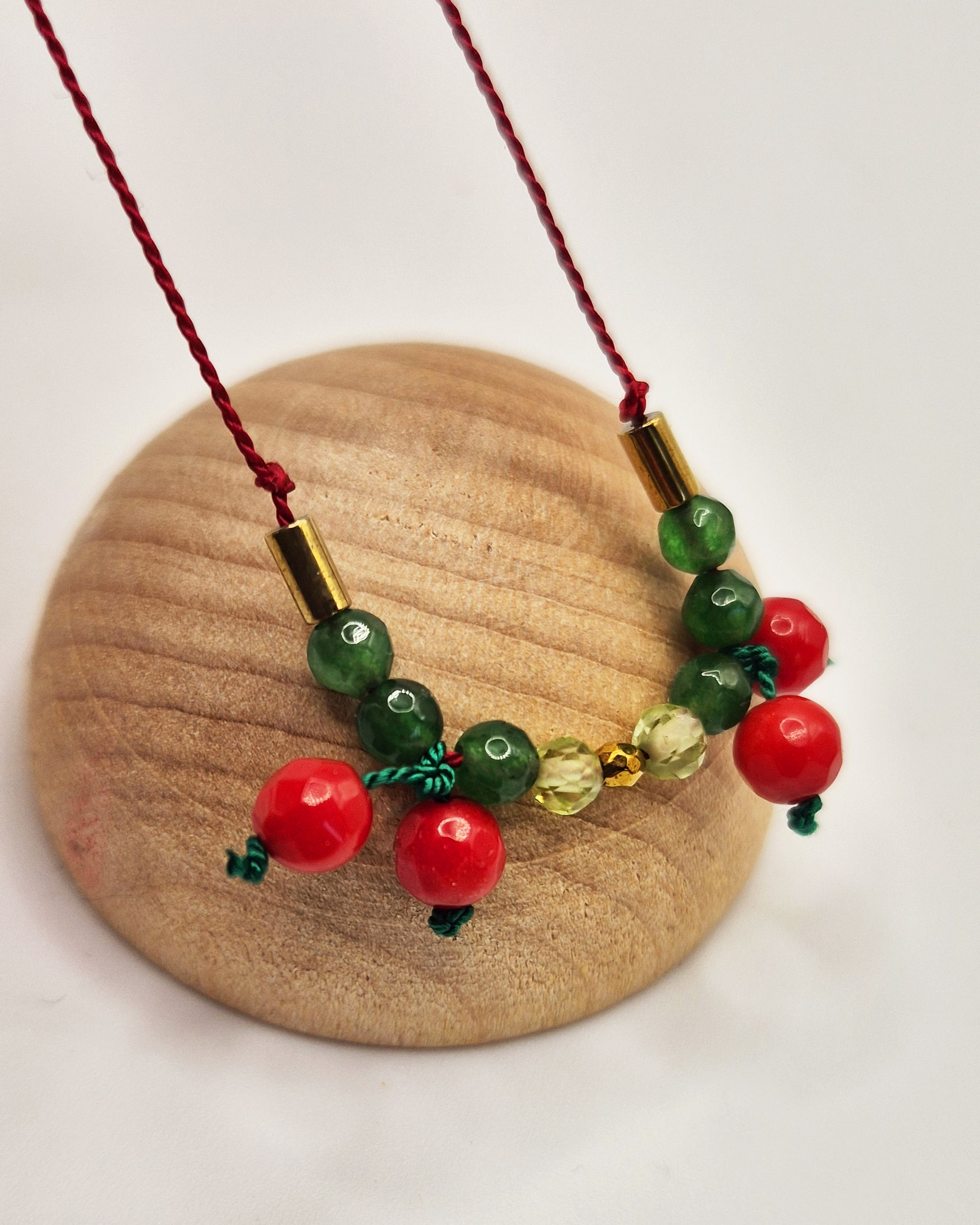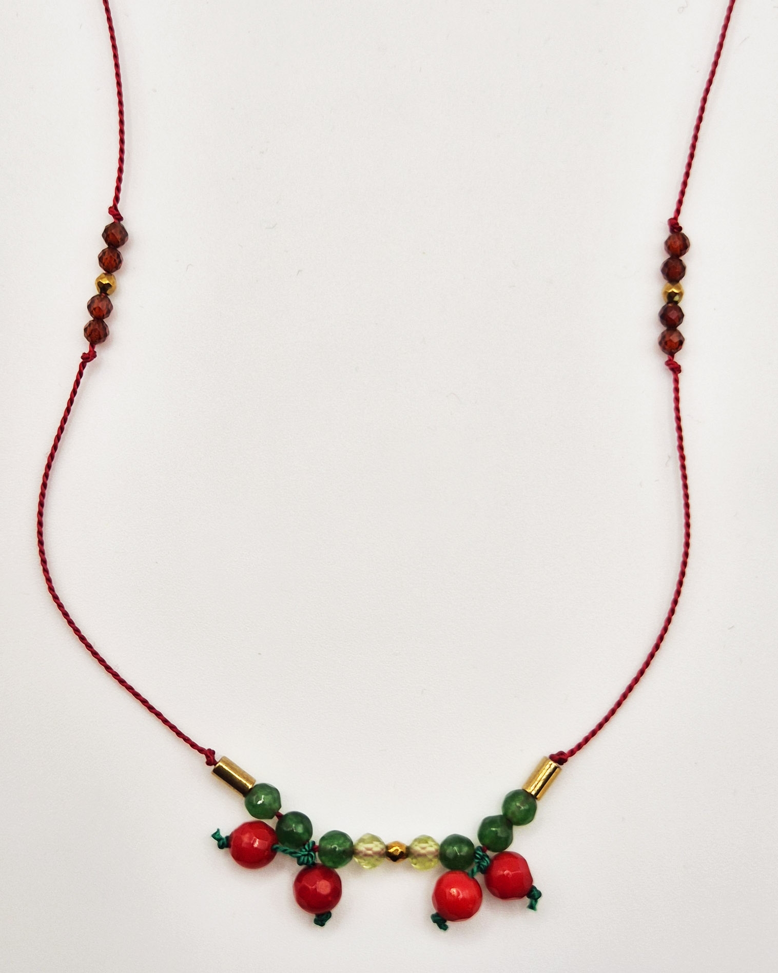 Naszyjnik Berry w wersji bordowo-czerwonej – kamienie naturalne na bordowej nici jedwabnej. Naszyjnik Berry to jesienny hit pełen kolorów i energii natury. Czerwony koral wprowadza ciepły, intensywny akcent, oliwin dodaje świeżej zieleni, agat zielony harmonizuje całość, granat wnosi głębię, a złoty hematyt subtelnie rozświetla kompozycję. Naszyjnik w wersji ze srebrnymi przekładkami może różnić się od wersji ze złotymi przekładkami, np. kuleczka w kolorze srebrnym, zamiast wałeczka w kolorze złotym.