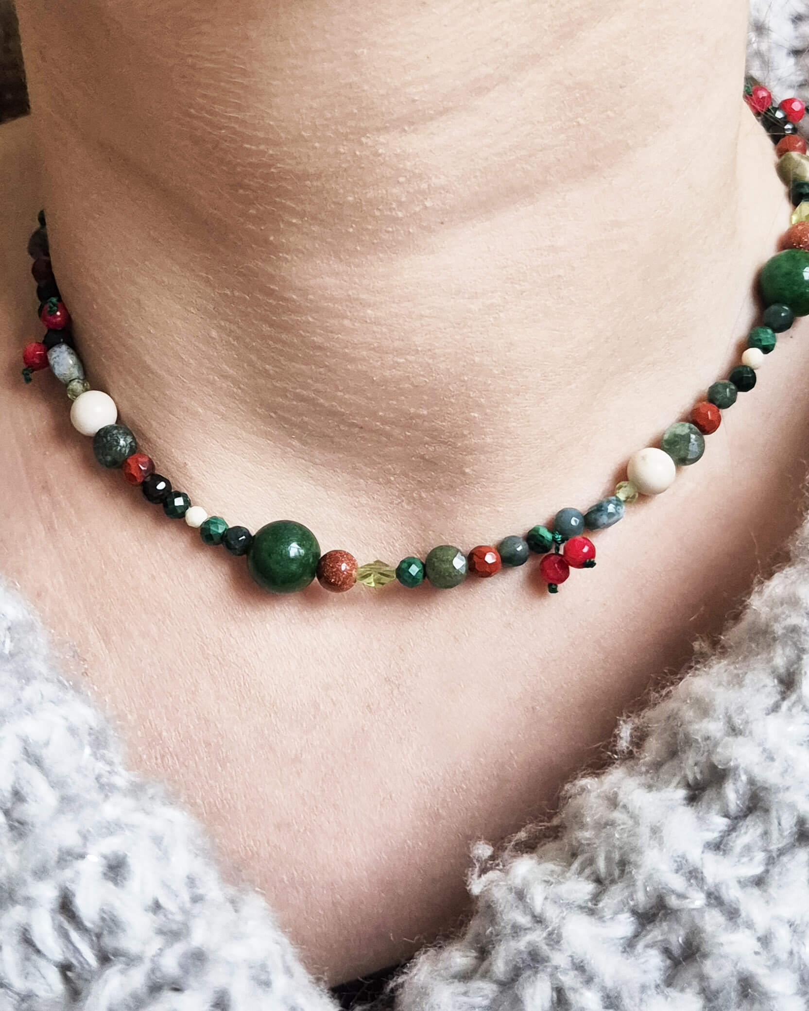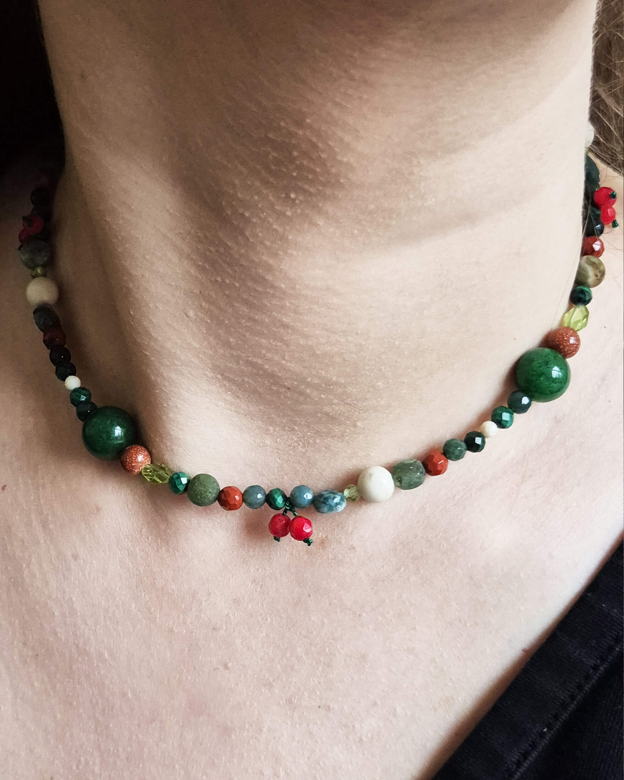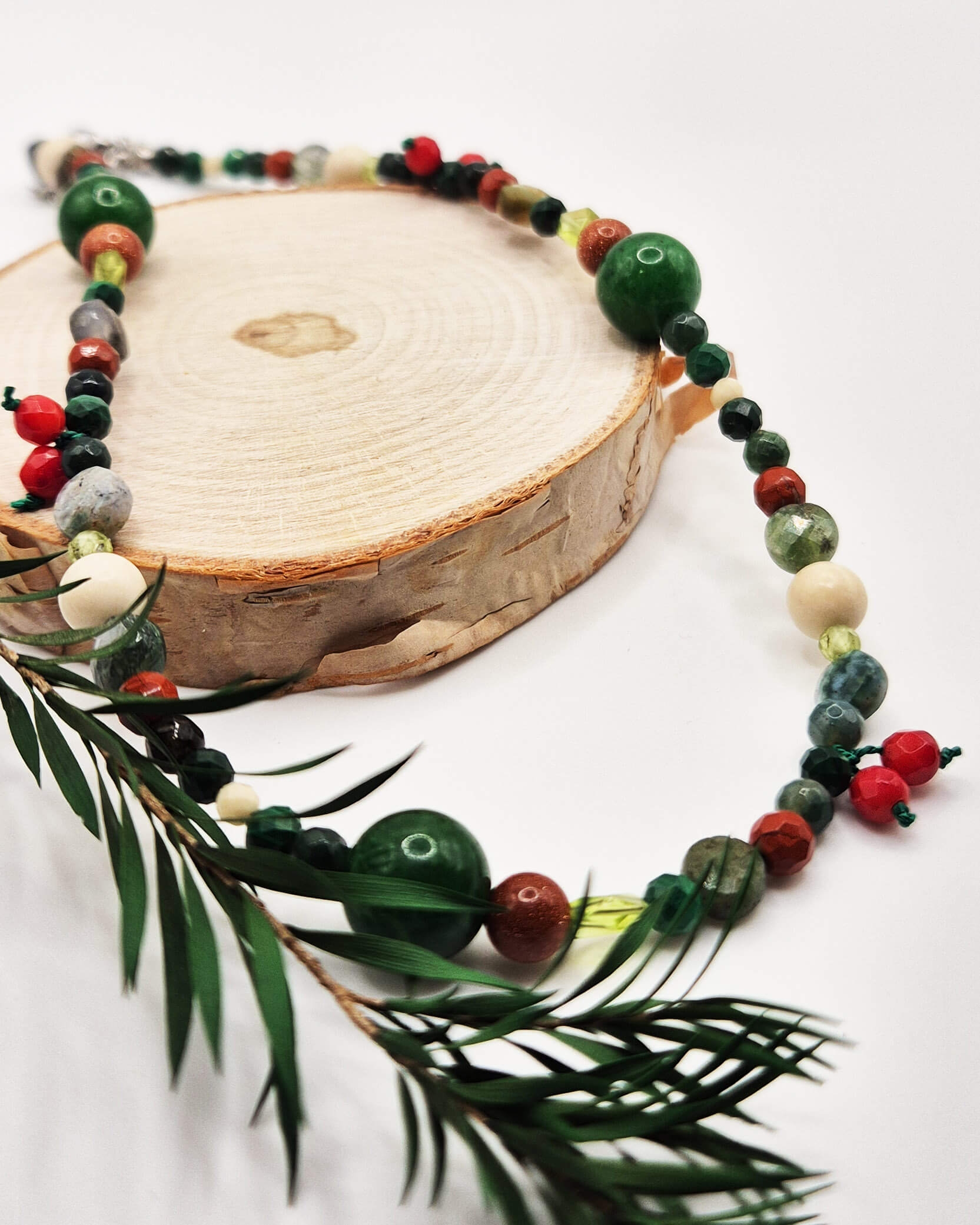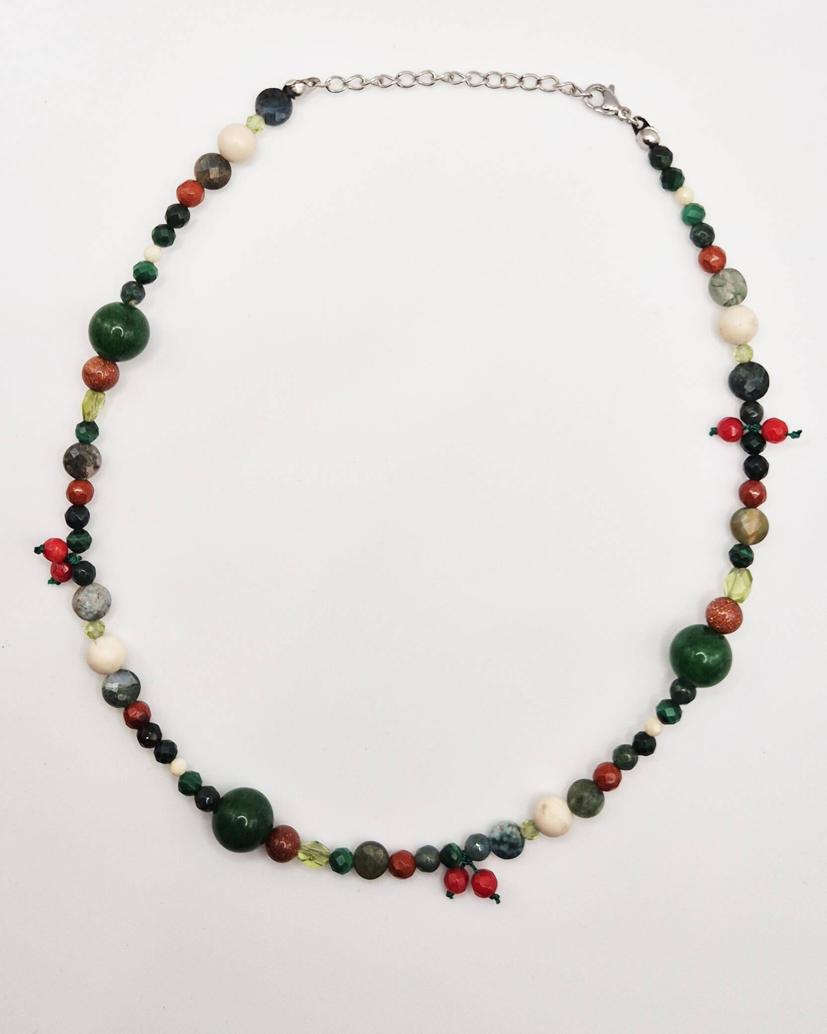 Naszyjnik z naturalnych kamieni: koral czerwony, kamień rzeczny, jaspis, jadeit, malachit, agat mszysty, agat indyjski, oliwin, piasek pustyni.