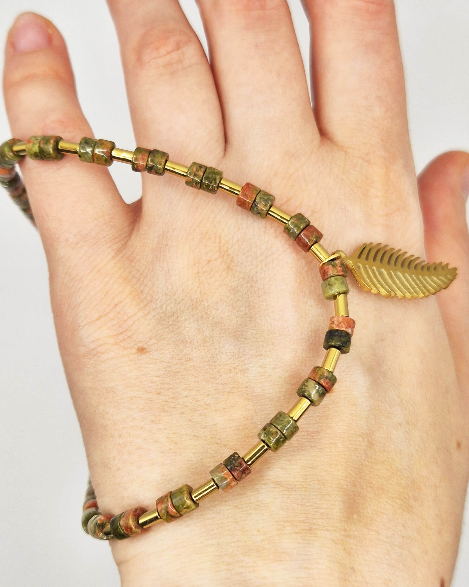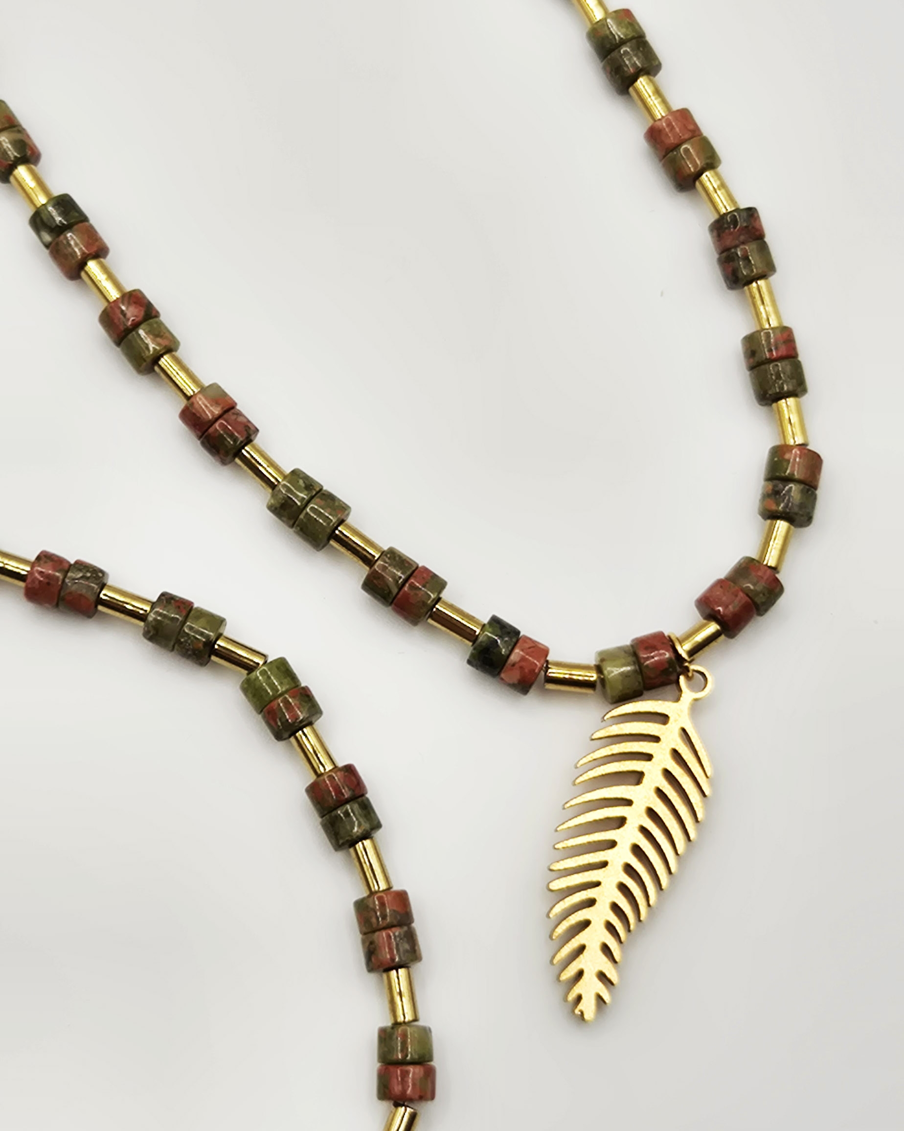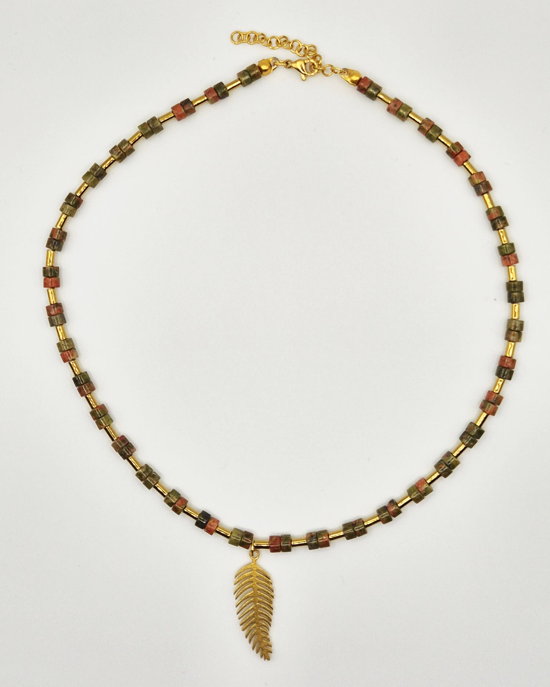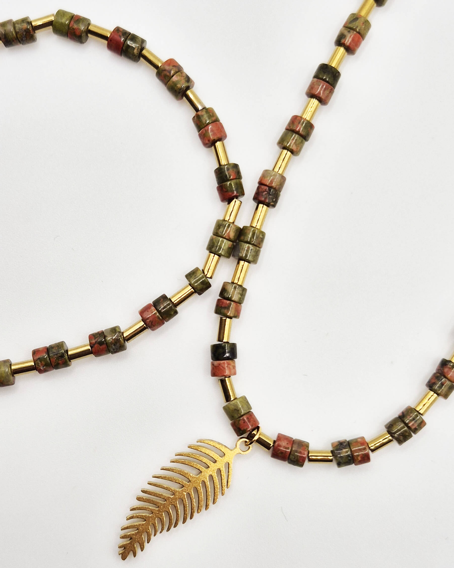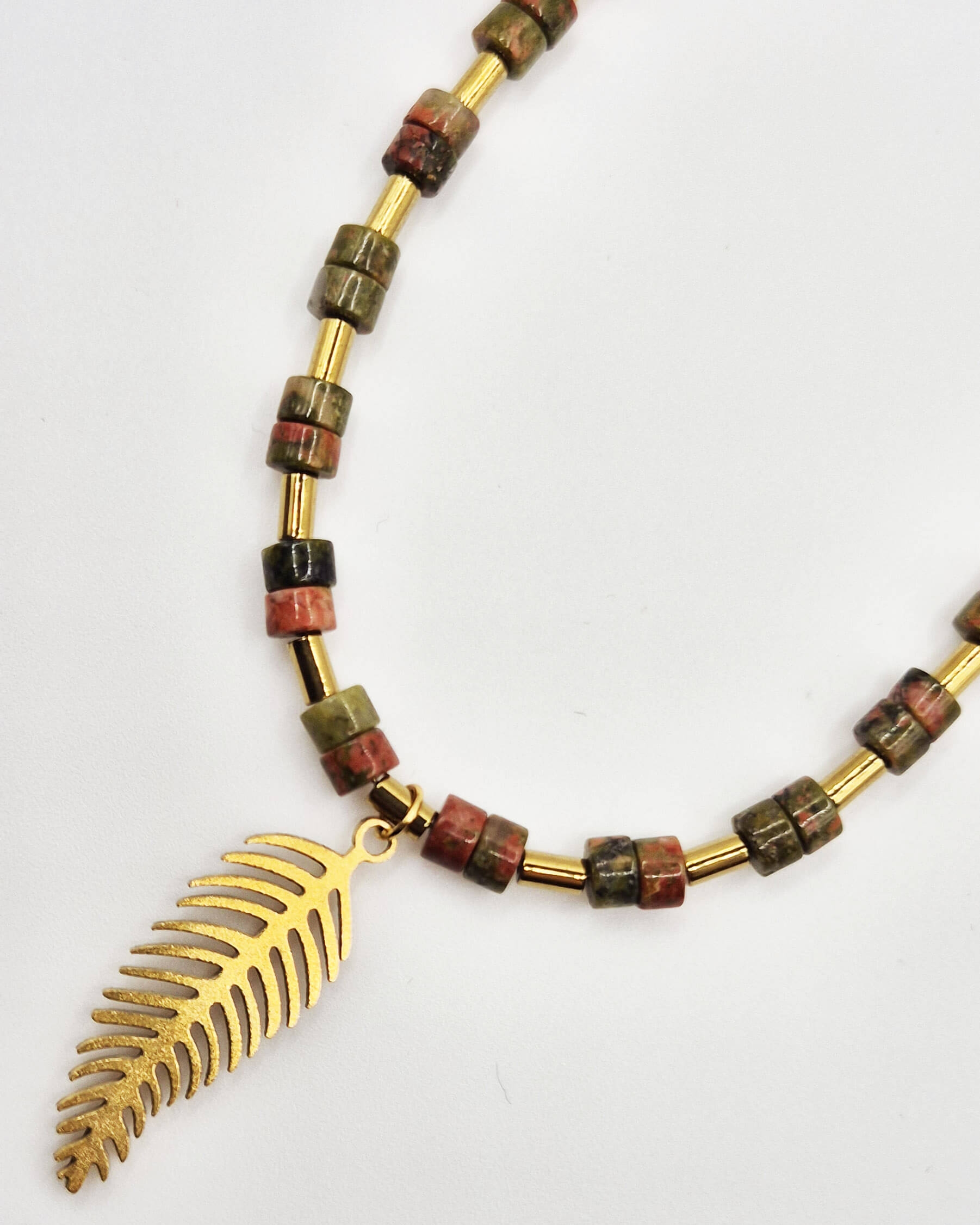 Naszyjnik Silvia z unakitem i złotym hematytem. Delikatna biżuteria handmade z liściem paproci – natura i elegancja w jednym.