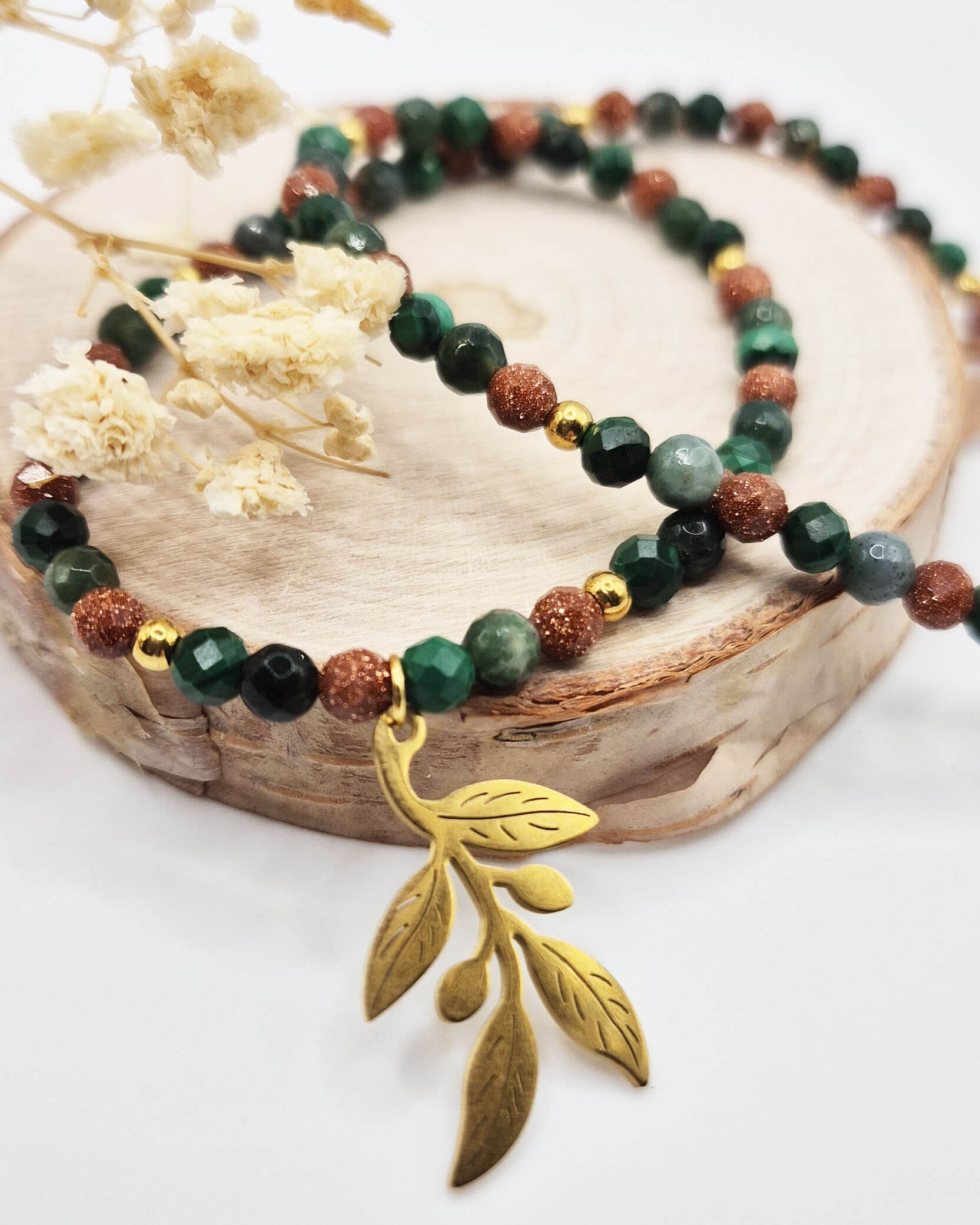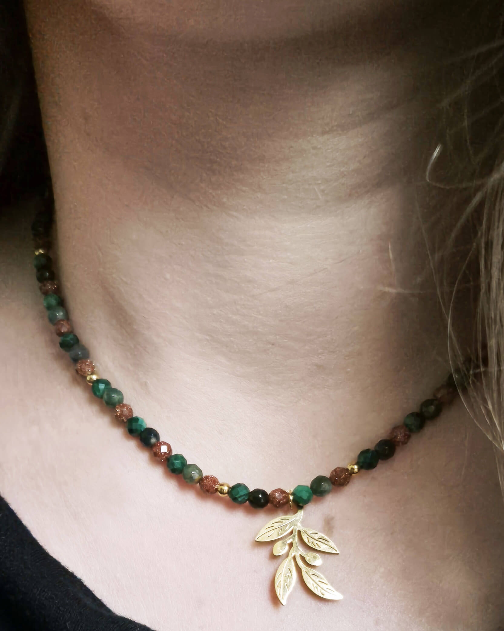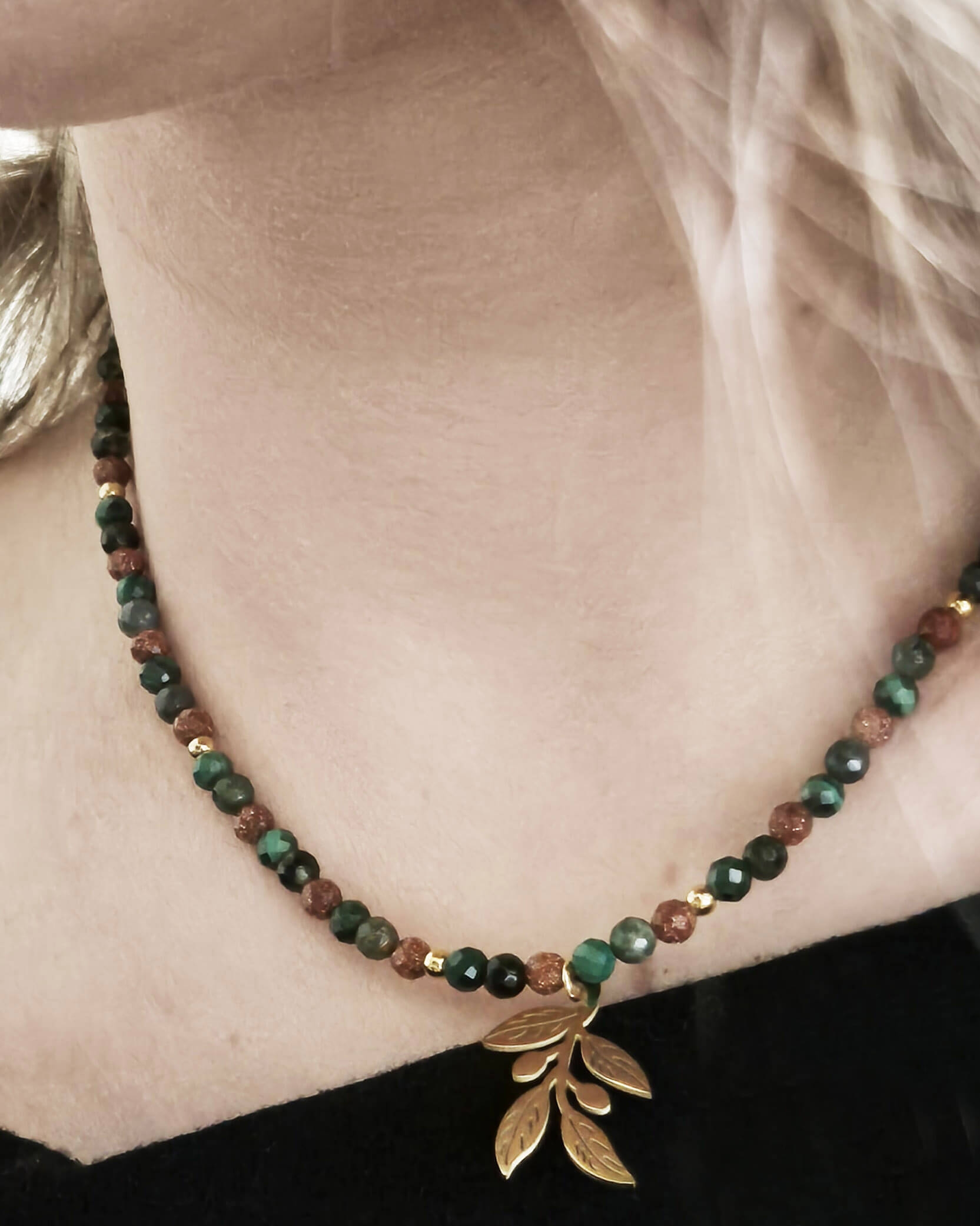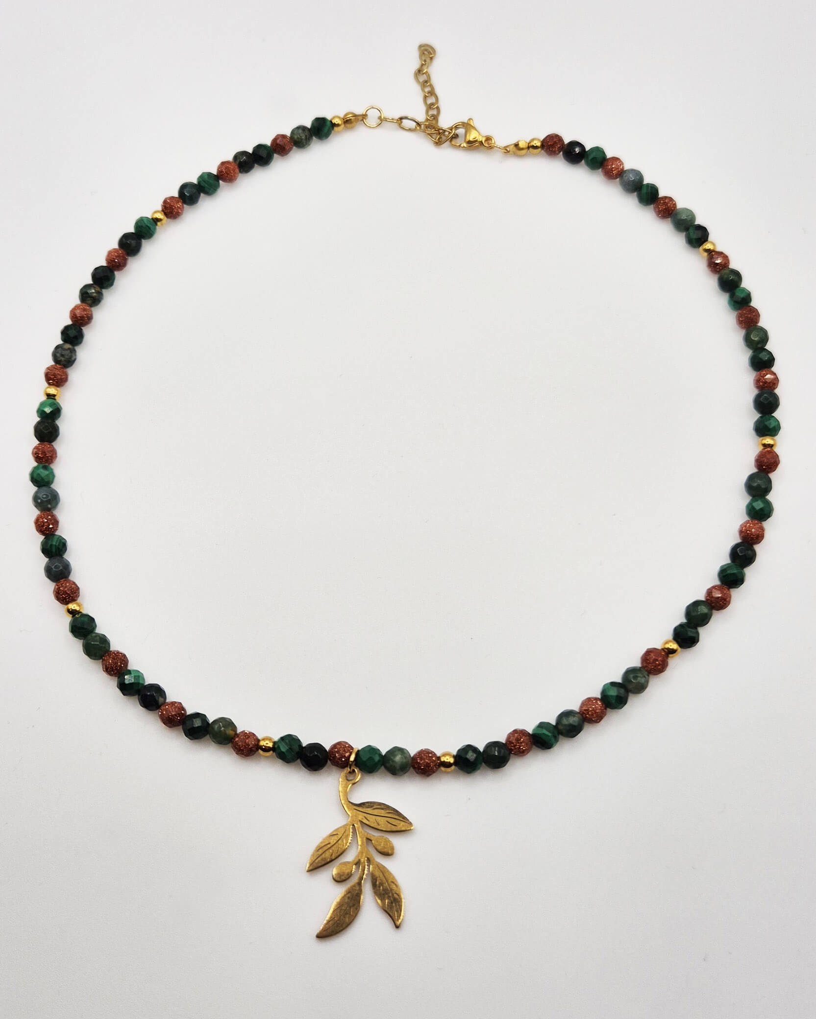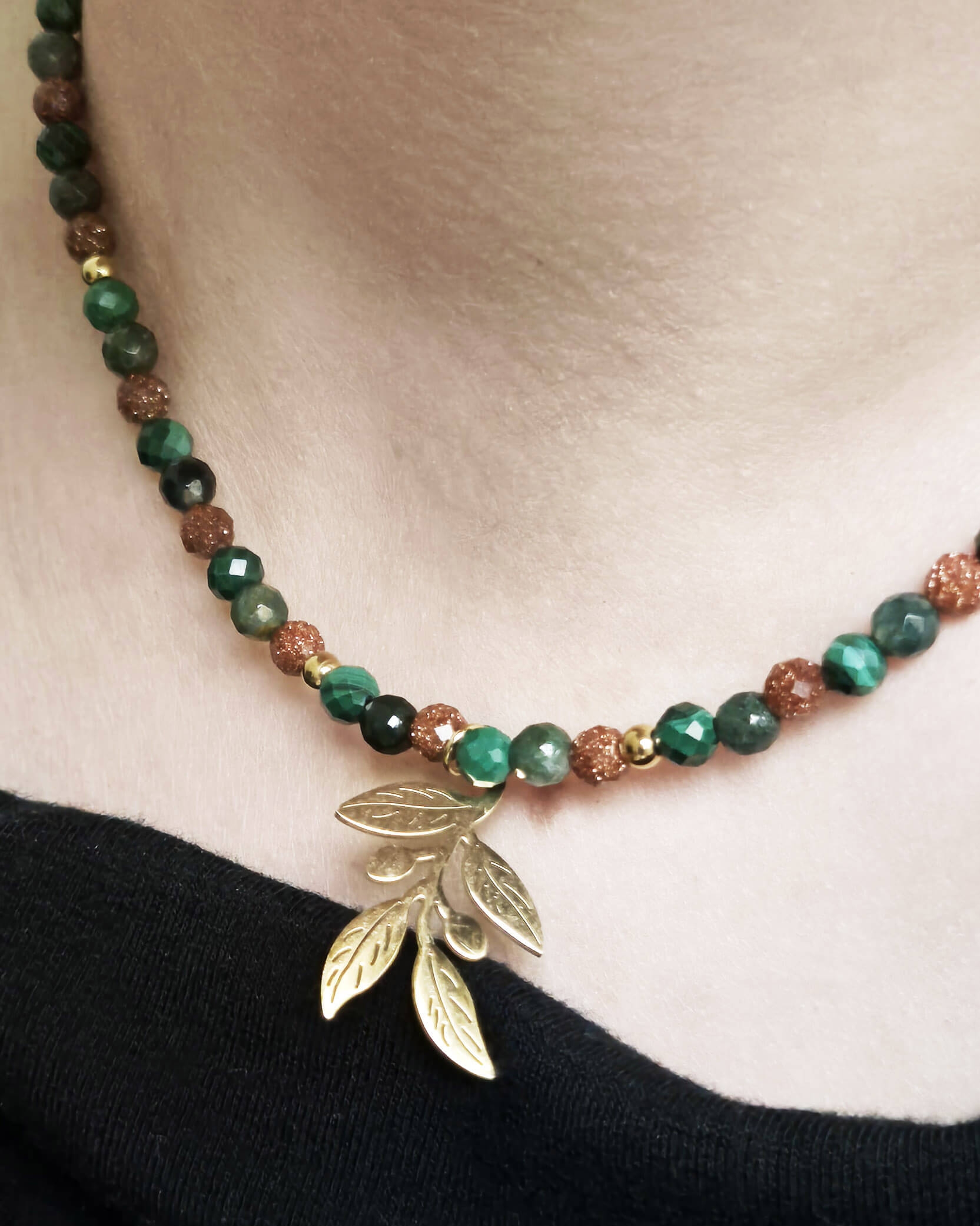 Naszyjnik z naturalnych kamieni – malachitu, agatu mszystego i piasku pustyni – to harmonijne połączenie natury, energii i ciepłych, ziemistych tonów. Wyjątkowy akcent stanowi zawieszka w kształcie liścia w kolorze złotym.