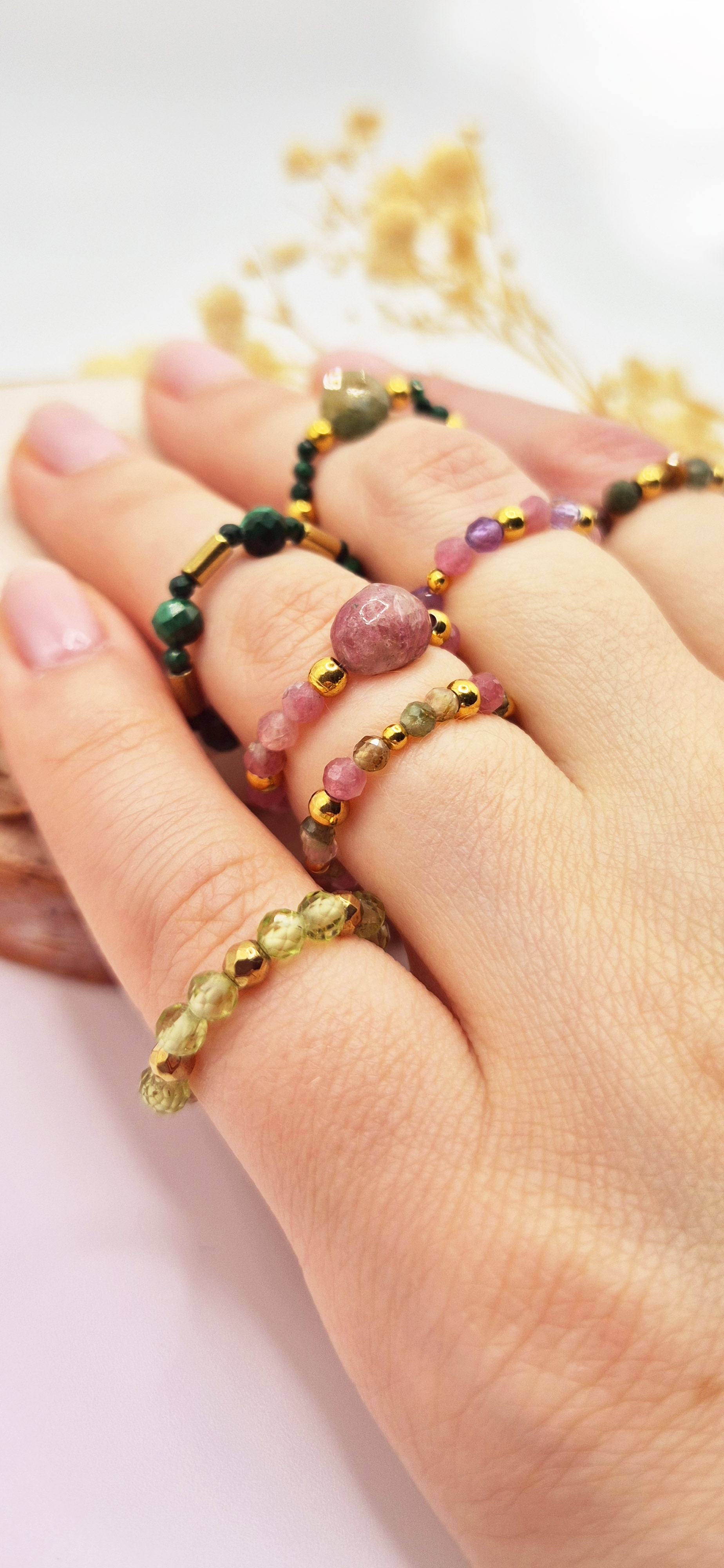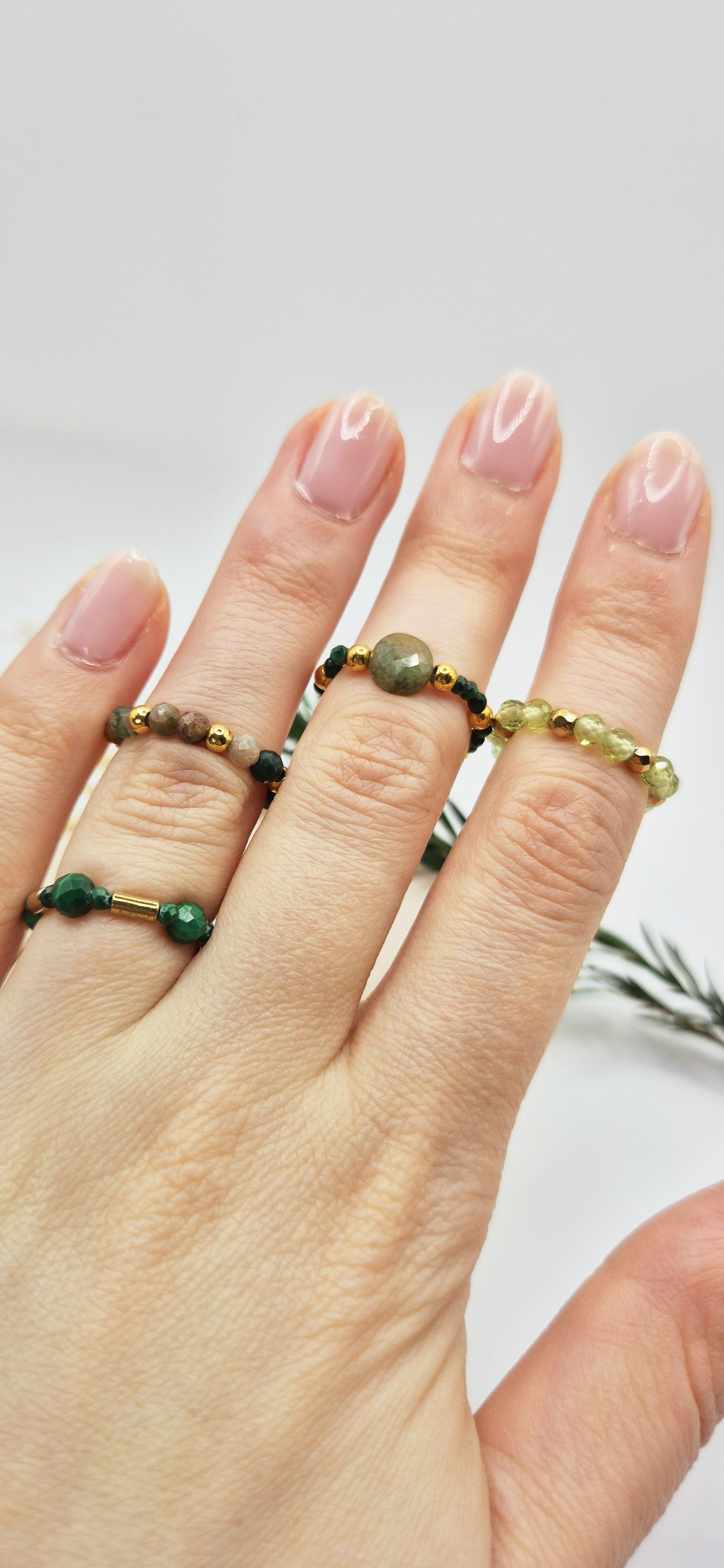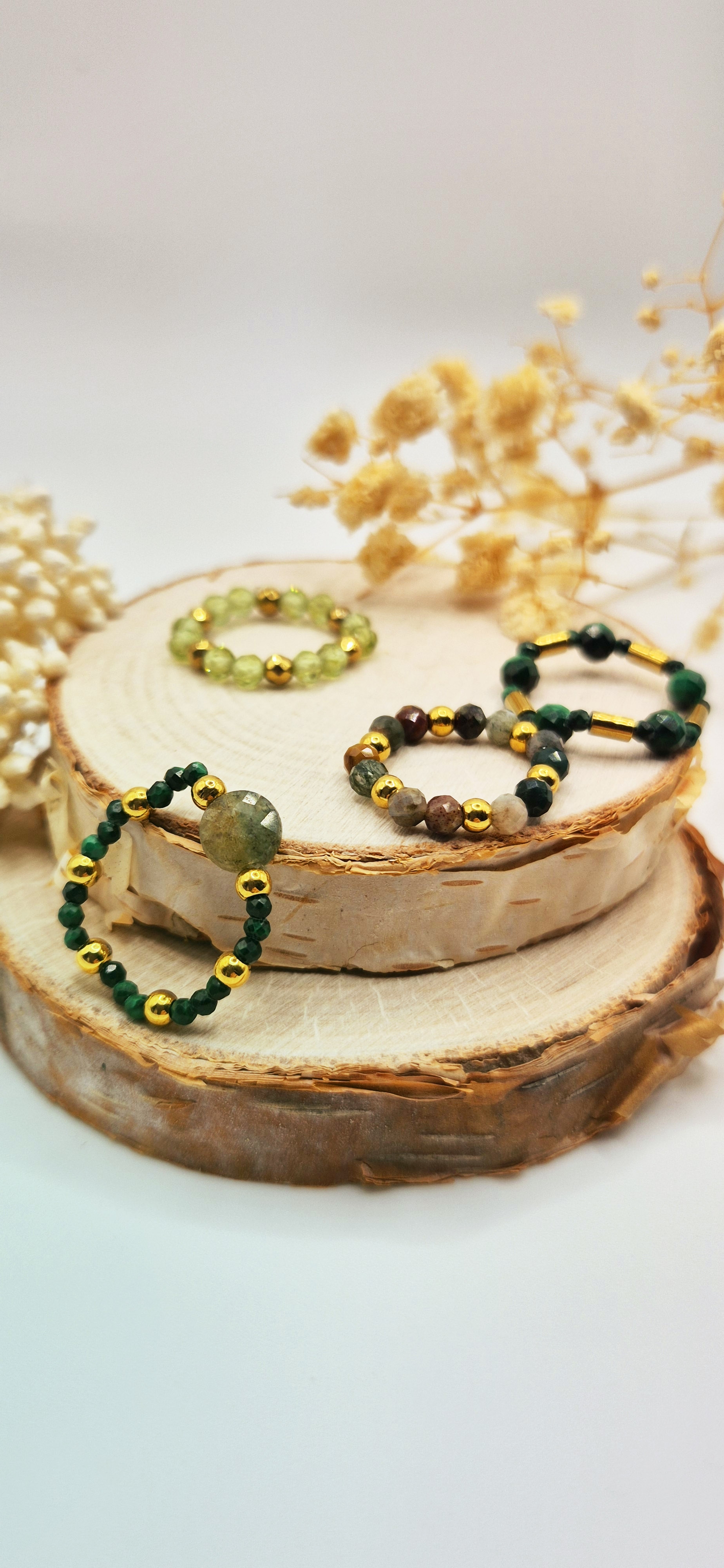 Ręcznie wykonany elastyczny pierścionek z kamieni naturalnych. Unikatowa biżuteria w ekologicznym opakowaniu, idealna na prezent. Możliwość zamówienia projektu według indywidualnego pomysłu.