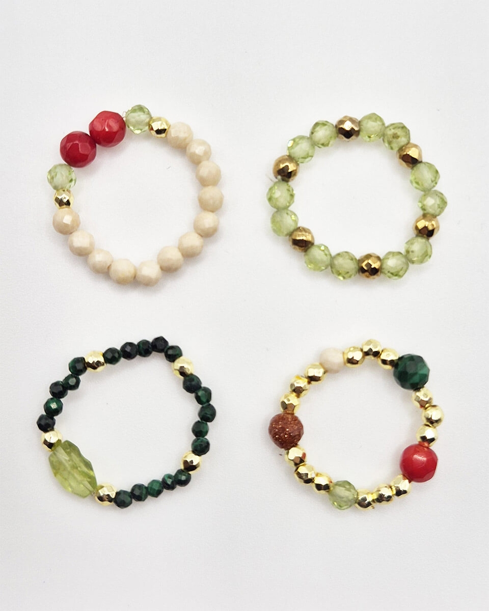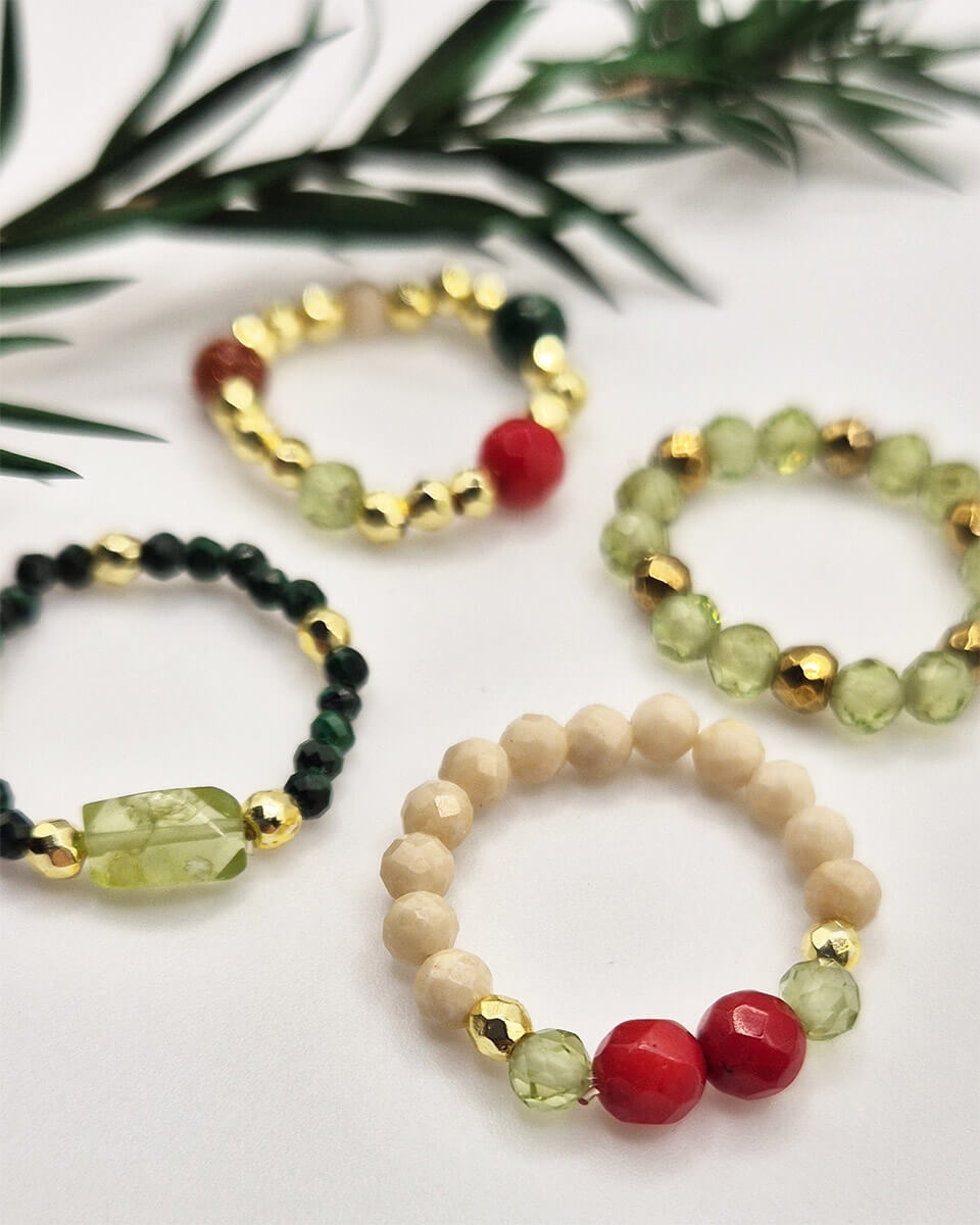 Zestaw czterech pierścionków w świątecznych barwach z naturalnych kamieni: czerwony koral, oliwin, malachit, kamień rzeczny i piasek pustyni. Delikatne, elastyczne i pełne blasku – idealne na zimowy czas i nie tylko.